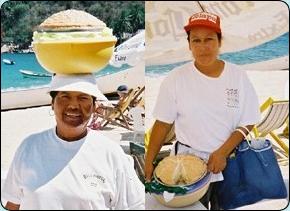 These are two of the "pie-ladies". They are on the beach every day selling freshly baked pies of various types. The pies that they sell are, lemon meringue, apple, banana, chocolate, cheese, coconut, and pecan. You can purchase them by the slice, or the entire pie. They will even bake to order. | |