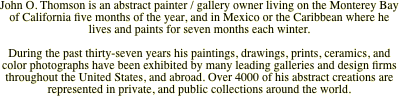 John O. Thomson is an abstract painter / gallery owner living on the Monterey Bay of California five months of the year, and in Mexico or the Caribbean where he lives and paints for seven months each winter. During the past thirty-seven years his paintings, drawings, prints, ceramics, and color photographs have been exhibited by many leading galleries and design firmsthroughout the United States, and abroad. Over 4000 of his abstract creations are represented in private, and public collections around the world. | |||||||||